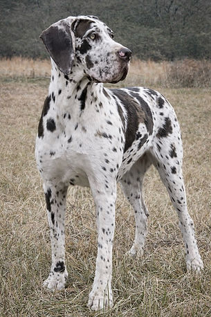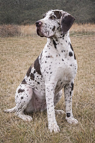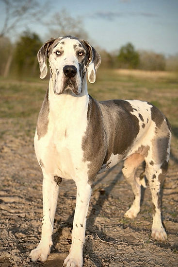 This is our beautiful Indy, she is a 50% European blue harlequin. She stands 37" tall and weighs 160 pounds. Indy has the most beautiful blue eyes and has the best temperament. She gets along great with everyone and has a docile demeanor.