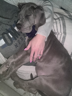 Hazel is a 63% European Blue Fawn. She stands 34" tall and weighs 148 pounds. She is absolutely precious, and she has the most beautiful babies. She and all her puppies are so loving and calm, we love our Hazel babies!